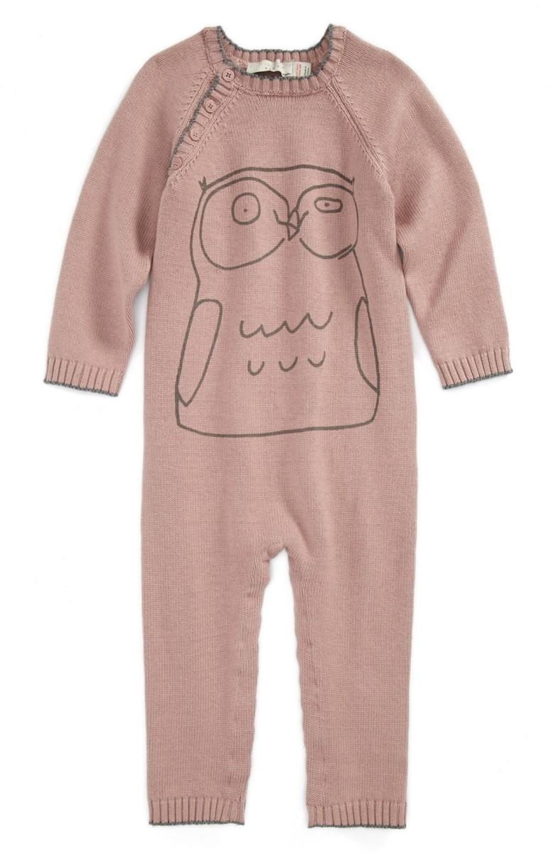 Tea-rose farvet med kontrasterende grøn syning, et billede af en ugle foran. Denne tynde og bløde buksedragt er lavet af bomuld i højeste kvalitet.